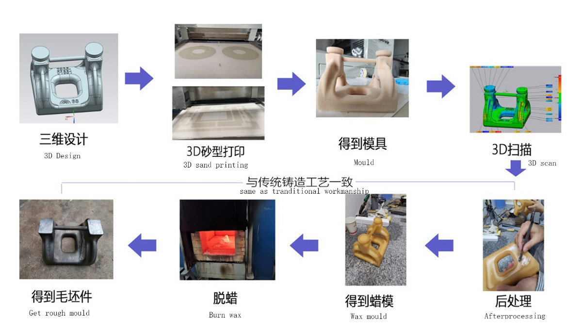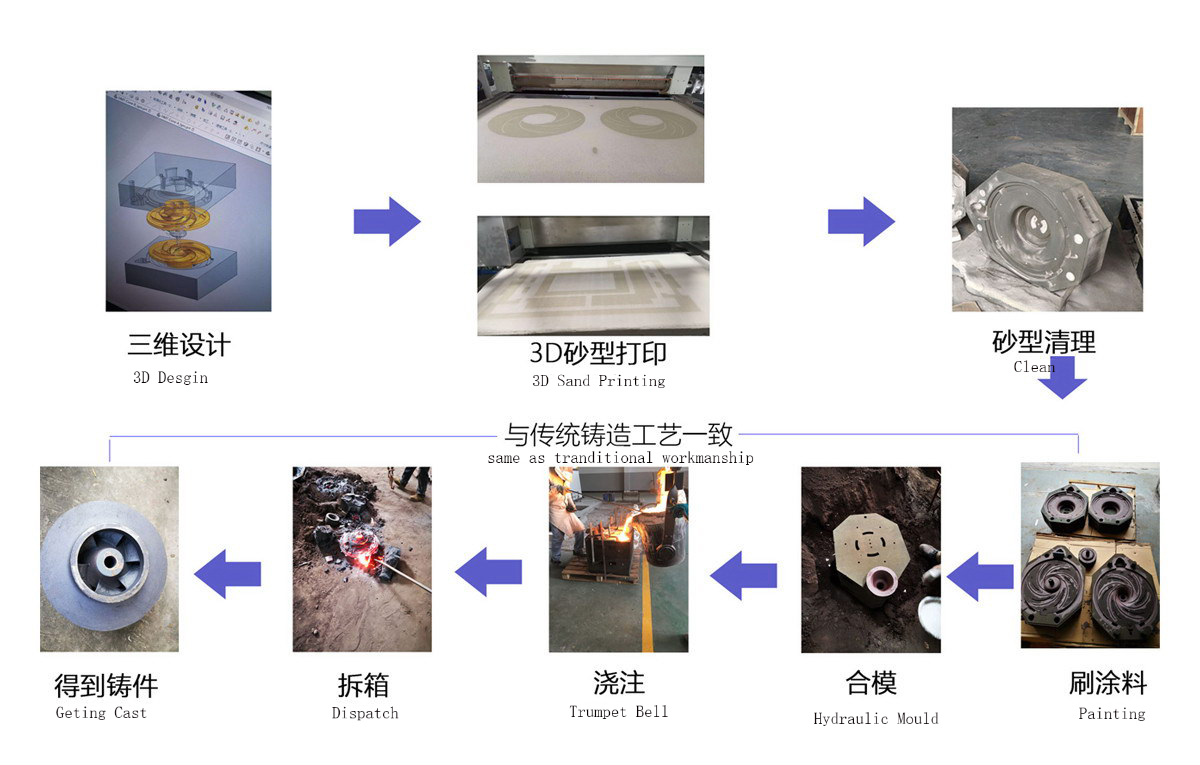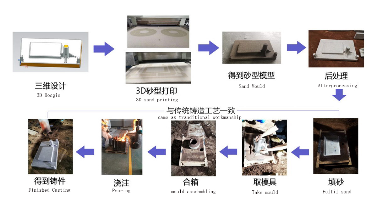 一、打印砂型用于砂型鑄造,鑄造流程如下 1. The printed sand mold is used for sand casting, and the casting process is as follows |